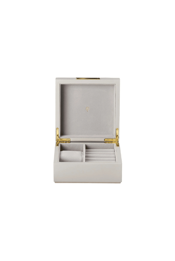 Jewellery travel case is een kleine, ronde, praktische sieradenopbergdoos voor op reis, maar ook thuis. Elegant gevoerd met zwart fluweel, met een vak voor ringen en oorstekers en een voor overige sieraden en manchetknopen. In het deksel bevindt zich een vak met elastiek.
