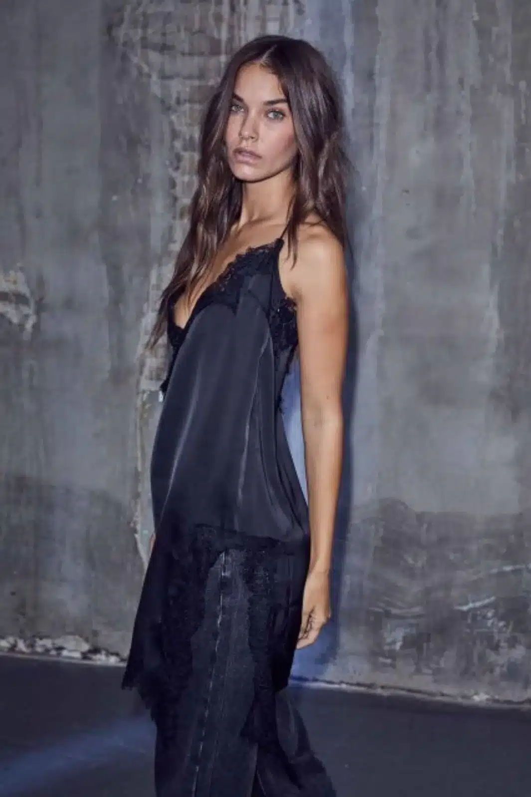 Trending! Zwarte lingerie-jurk van Haute L’Amitié met kanten randen bij de halslijn en aan de onderkant. De jurk heeft dunne bandjes en een asymmetrische snit.