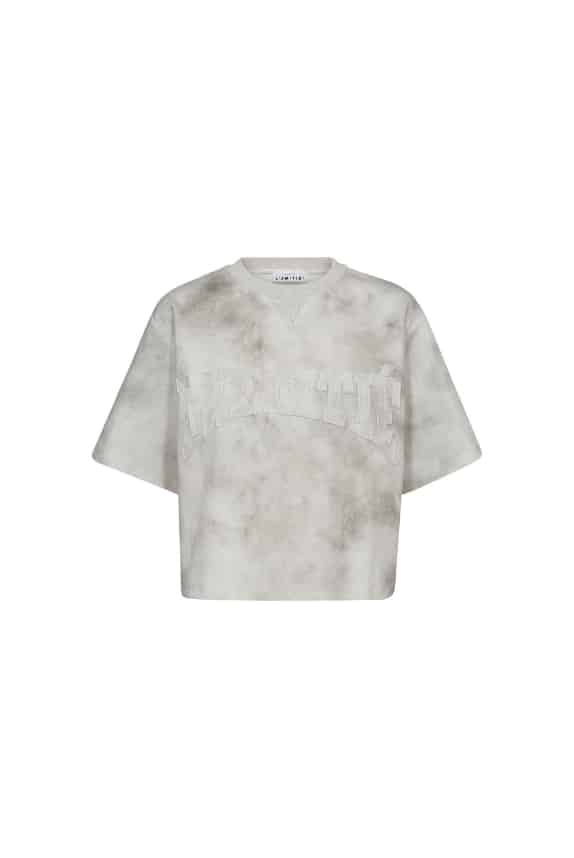 Toffe sweater, grijs-wit gemeleerd met een klassieke geribde hals en een korte mouw. Haute L’Amitie logo op de borst. Stijl hem af met een mesh-blouse eronder.