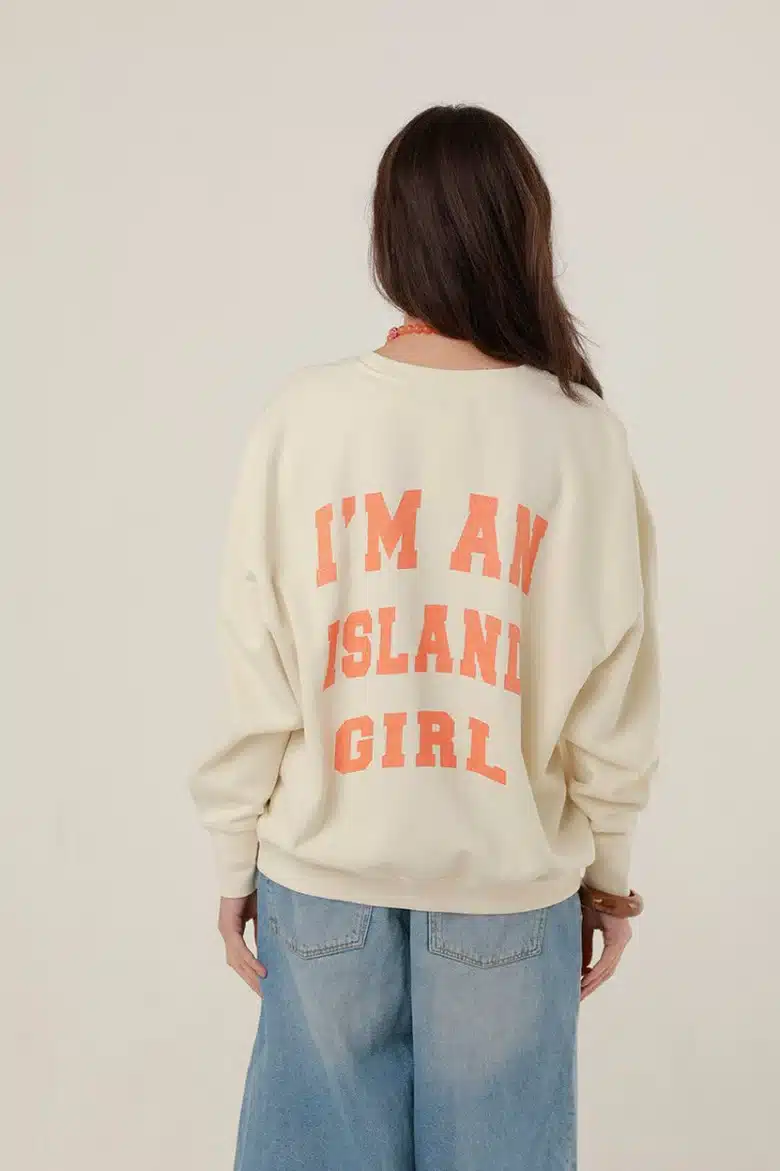 Op de voorzijde de tekst “I’m not a tourist”. Maar dat is nog niet alles: op de achterzijde vind je de inspirerende tekst “I’m an island girl”, wat de trui een heerlijke vakantie-vibe geeft.